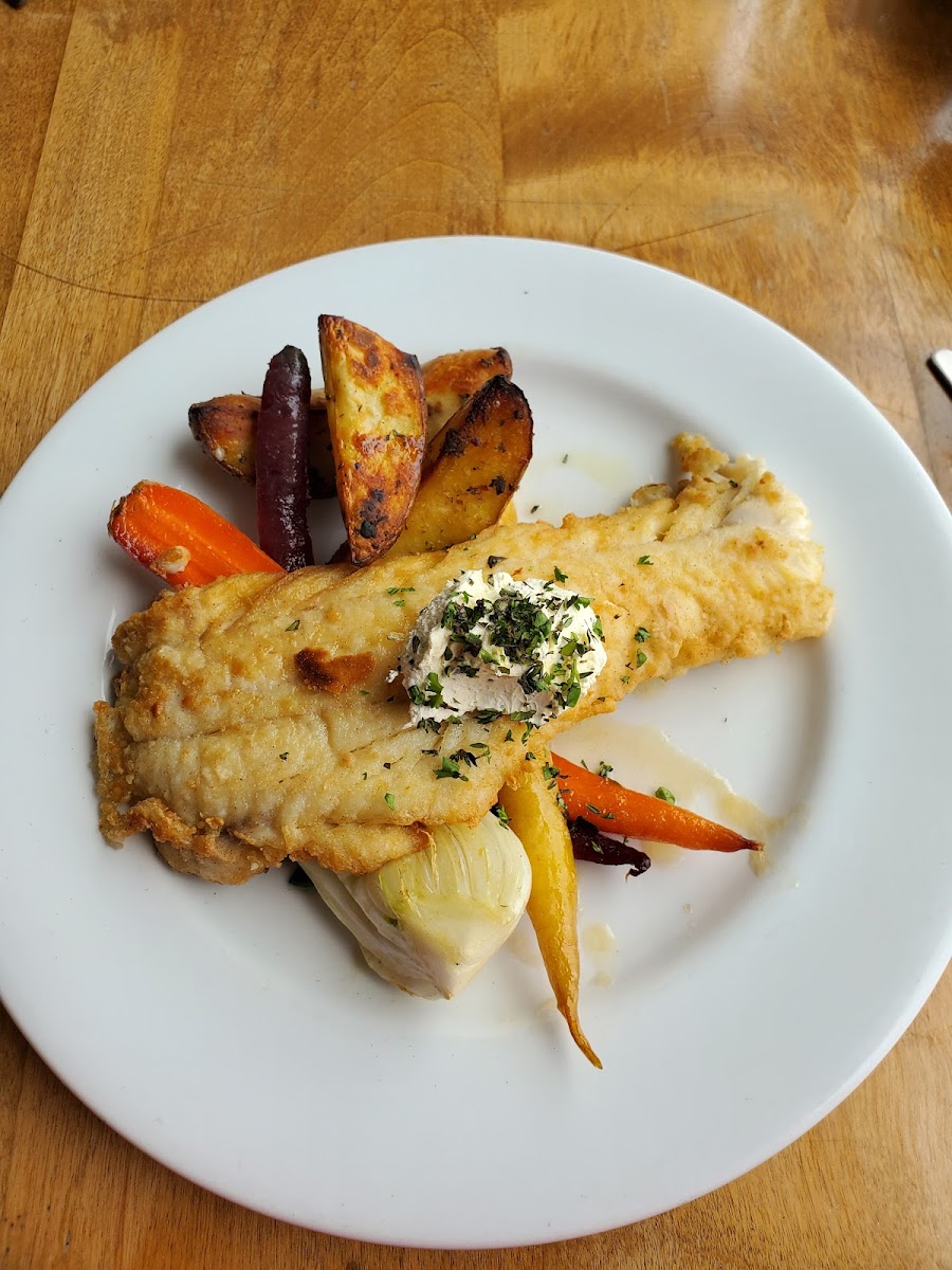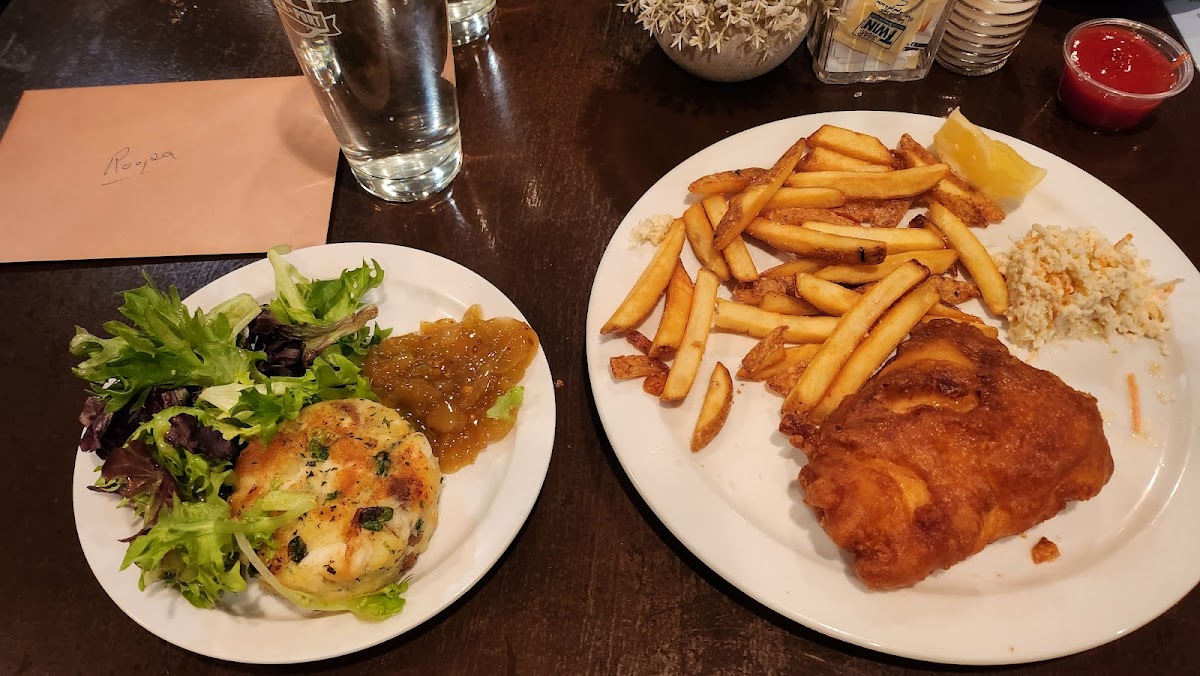 Beautiful patio! I have 4 stars because the fish cakes was mainly mashed potatoes; I don't know if there was even fish inside? However, my colleague had the chowder and it was incredible he says! The waitress was friendly and fun.