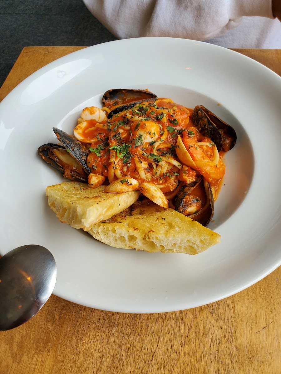 While Spinnaker is a private club, they also welcome guests, so don't hesitate to make a reservation. There is inside and outside dining, both with unobstructed views of the water. After making a reservation (with only a 30 minute notice) we were greeted by a lovely hostess that arranged our table near the window for a great view. Water was waiting for us at our table and menus were quickly delivered. We ordered the Seafood Linguine ($21) and Pan Fried Haddock ($21), no appetizers or drinks. The food came quickly, and was delicious! Fish cooked to perfection and the accompanying vegetables were awesome! The Pasta was also cooked to perfection and tasty! Good portion of mussels, clams, shrimp and scallops. The garlic bread added a nice touch. This restaurant is right on the water with amazing views. Highly recommend.